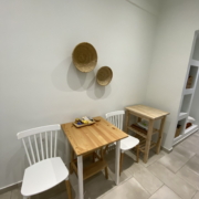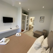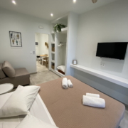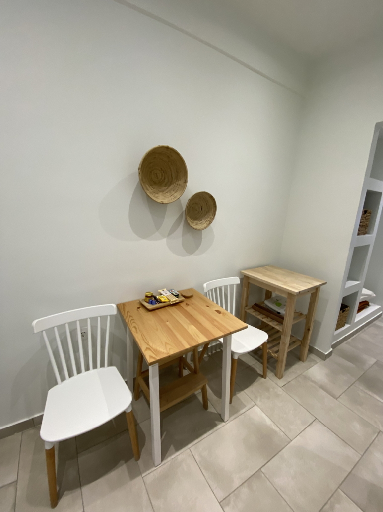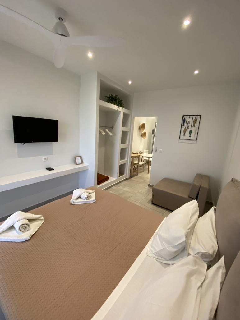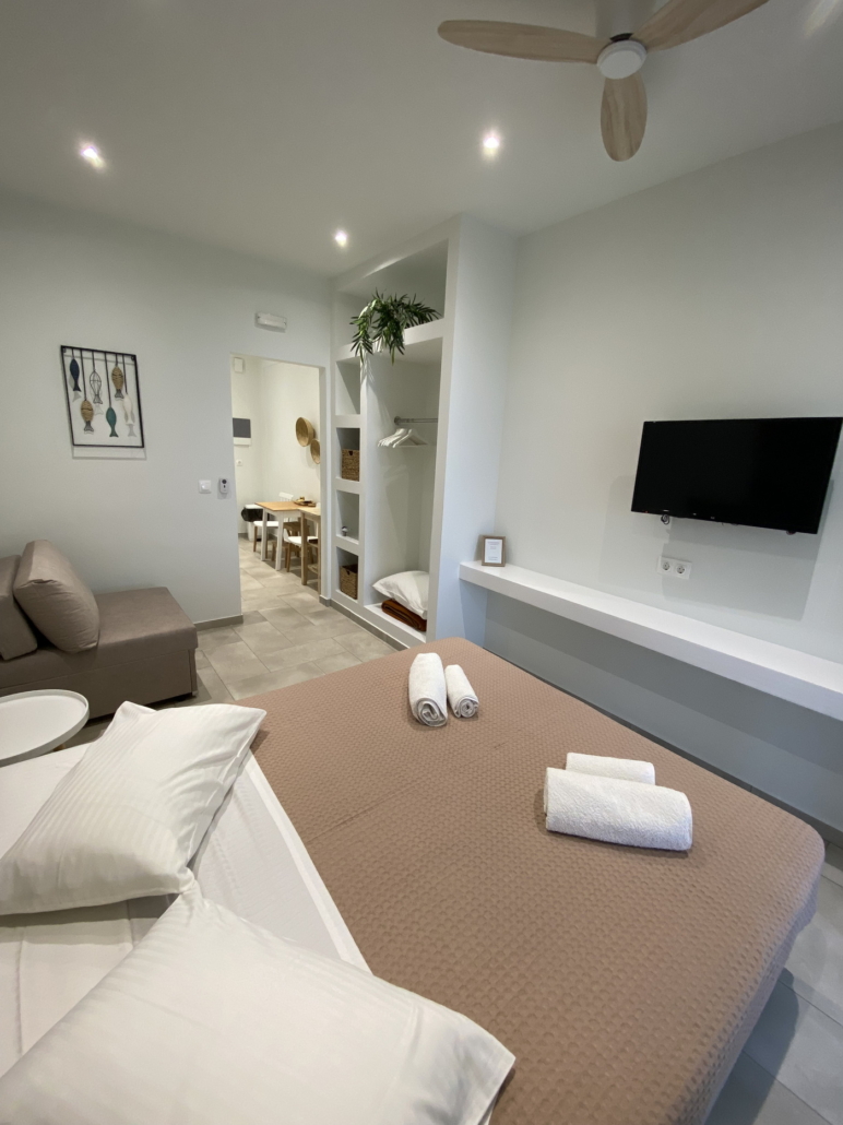 Στο ισόγειο τα 2 διαμερίσματα αποτελούνται το καθένα από κρεβατοκάμαρα με ένα διπλό κρεβάτι και ένα καναπέ κρεβάτι, ντουλάπα, δορυφορική τηλεόραση, κουζίνα πλήρως εξοπλισμένη (ψυγείο, κουζίνα, τραπέζι, καφετιέρα, τοστιέρα) και ένα μπάνιο με ντουζιέρα.